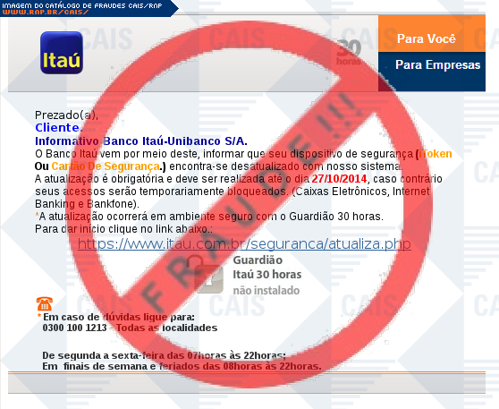 Esta página tem função informativa e educativa. Exibe uma coleção de imagens de phishing scam (fraudes eletrônicas) ou malware (código malicioso) veiculados por meio de spam (e-mail não-solicitado). Trata-se de conteúdo exemplificativo, não exaustivo, uma vez que não é possível contemplar todos os casos de fraudes existentes. Assim, caso você tenha conhecimento de um exemplar que não esteja aqui presente, isto não significa que não seja válido ou real. Inclusive incentivamos que você o envie para análise do CAIS para que, se for o caso, passe a integrar o nosso acervo.