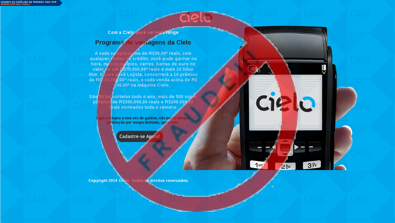 | comentário | A vítima recebe um e-mail informando sobre promoções relacionados a seu cartão Cielo sendo necessário realizar um cadastro, no entanto a página é falsa destinada a roubar os dados do cartão de crédito do usuário. | |