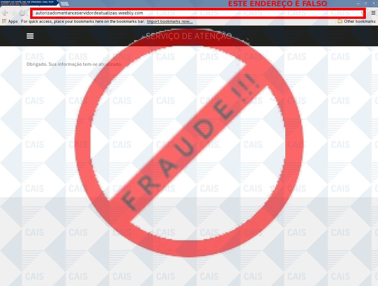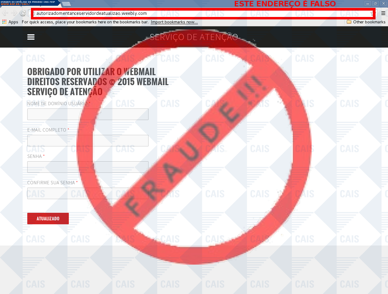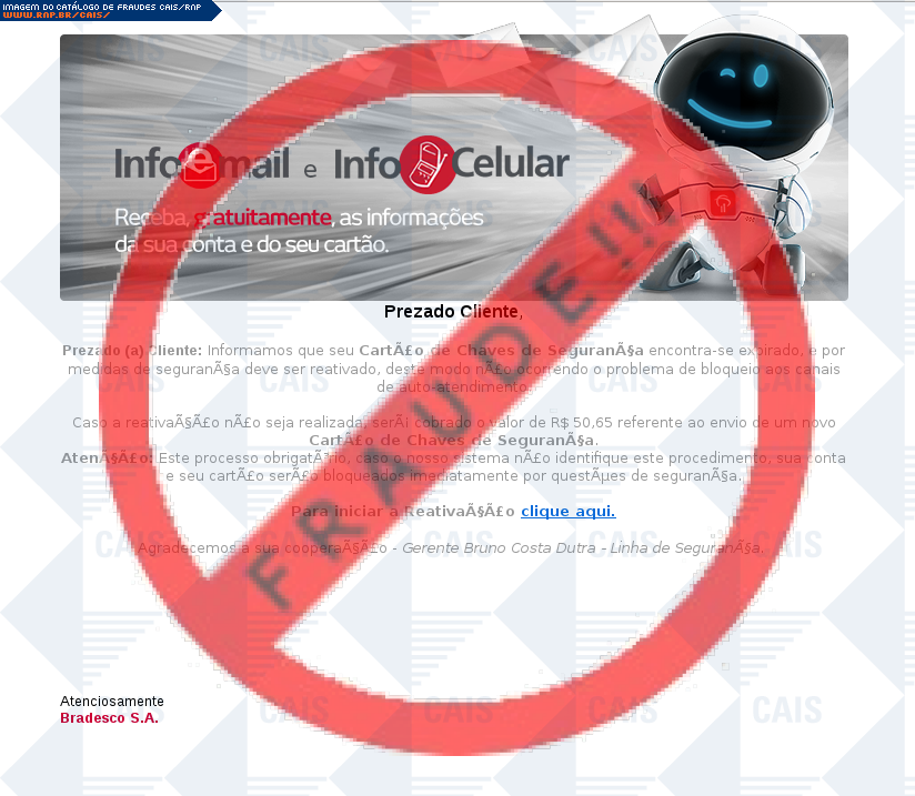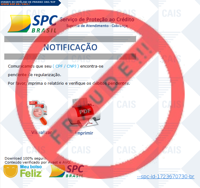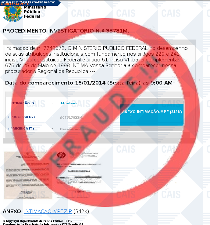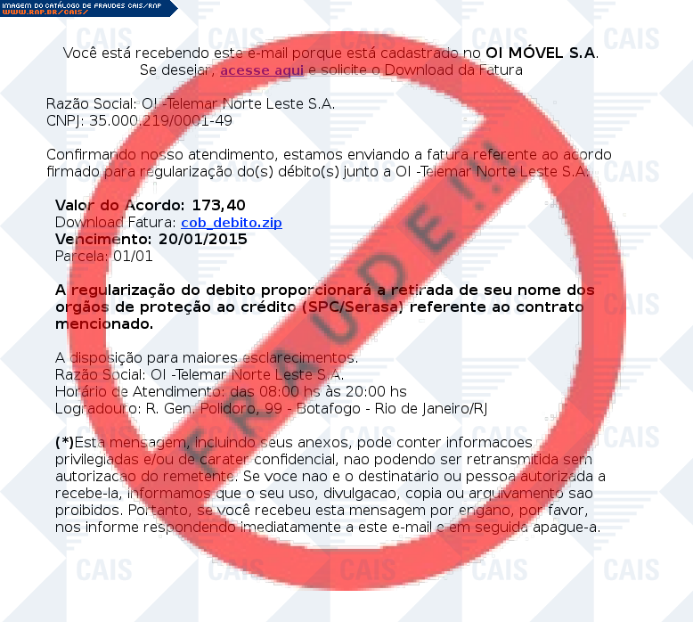 Esta página tem função informativa e educativa. Exibe uma coleção de imagens de phishing scam (fraudes eletrônicas) ou malware (código malicioso) veiculados por meio de spam (e-mail não-solicitado). Trata-se de conteúdo exemplificativo, não exaustivo, uma vez que não é possível contemplar todos os casos de fraudes existentes. Assim, caso você tenha conhecimento de um exemplar que não esteja aqui presente, isto não significa que não seja válido ou real. Inclusive incentivamos que você o envie para análise do CAIS para que, se for o caso, passe a integrar o nosso acervo.