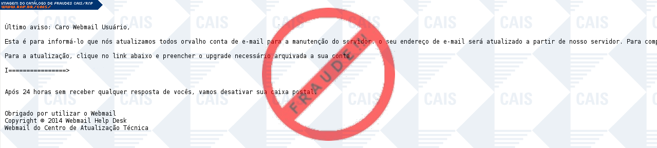 | assunto | Último aviso: Caro Webmail Usuário, | |
