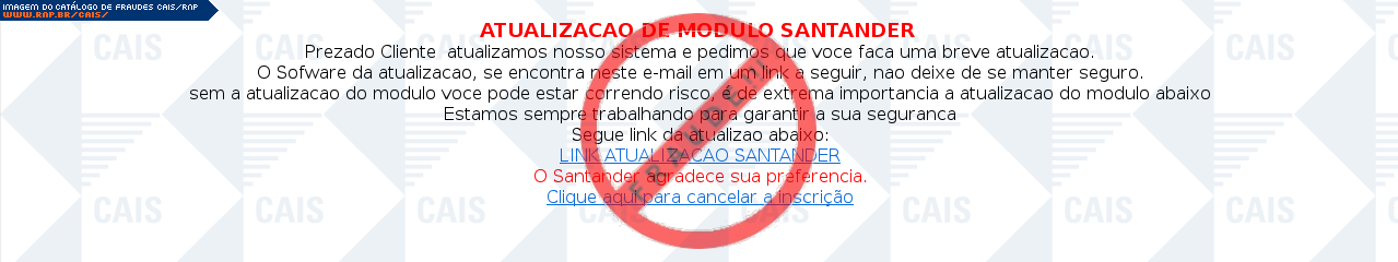 | comentário | O usuário recebe uma mensagem solicitando atualização do modulo de segurança do banco Santander estando o software disponível para download, no entanto o arquivo originado é malicioso criado para roubar informações da vítima e instalar outros arquivos fraudulentos... (leia mais) | |