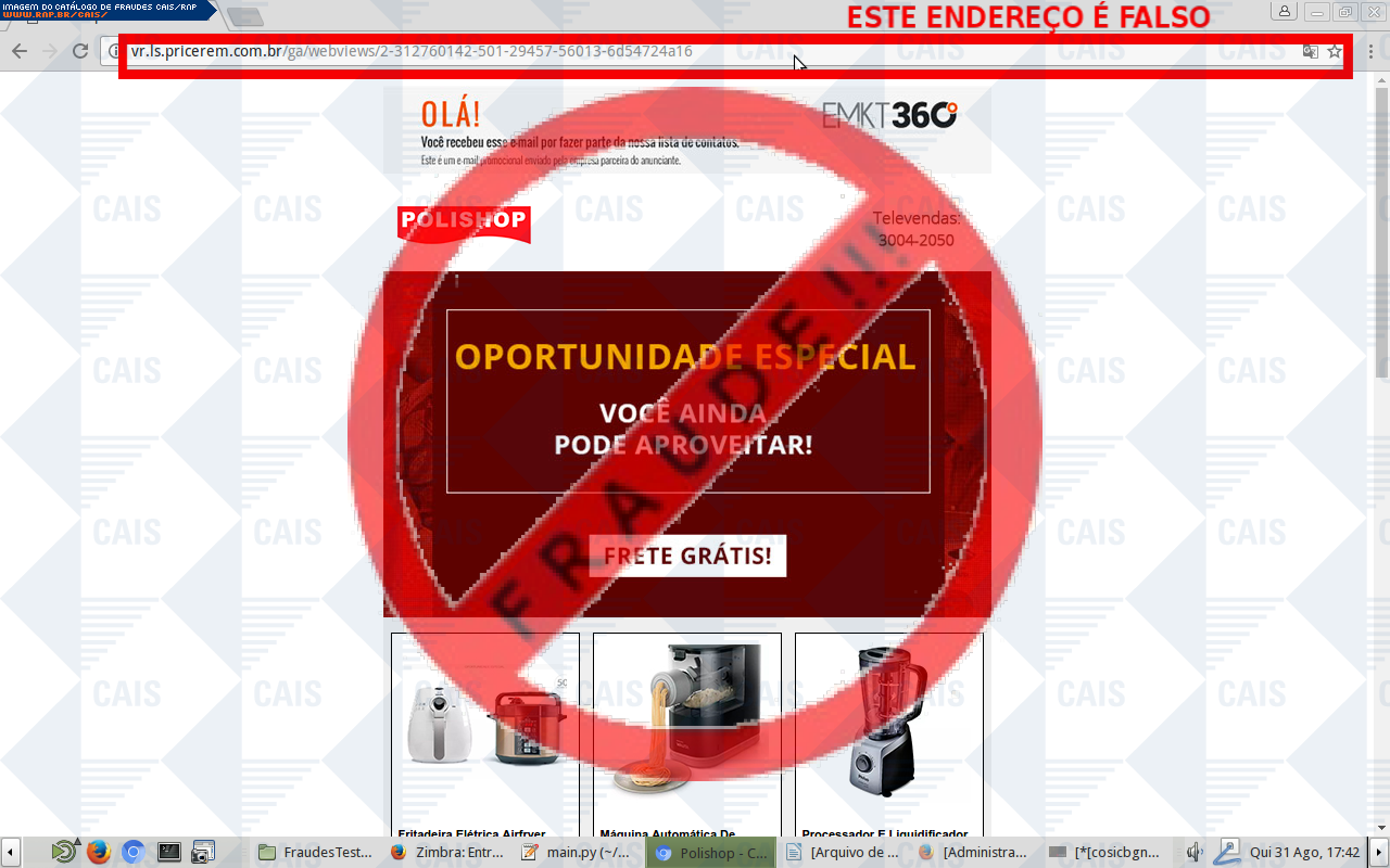 | comentário | Site fraudulento em nome da Polishop disponibiliza link malicioso para usuário. | |