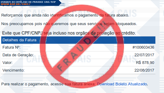Esta página tem função informativa e educativa. Exibe uma coleção de imagens de phishing scam (fraudes eletrônicas) ou malware (código malicioso) veiculados por meio de spam (e-mail não-solicitado). Trata-se de conteúdo exemplificativo, não exaustivo, uma vez que não é possível contemplar todos os casos de fraudes existentes. Assim, caso você tenha conhecimento de um exemplar que não esteja aqui presente, isto não significa que não seja válido ou real. Inclusive incentivamos que você o envie para análise do CAIS para que, se for o caso, passe a integrar o nosso acervo.