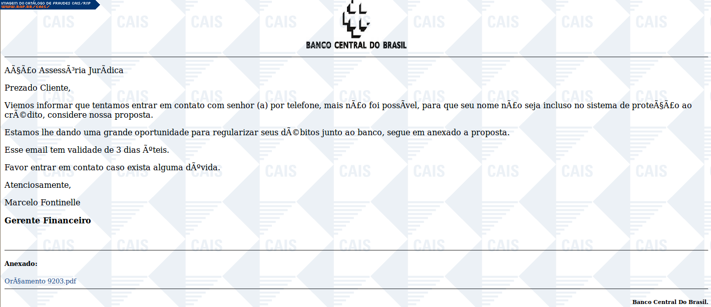 | comentário | A fraude, em nome do Banco Central, contém um link para um suposto documento sobre a negociação de débitos da vítima com o banco. O link leva ao arquivo malicioso que foi identificado como Worm.Win32.WBNA (Ikarus). | |