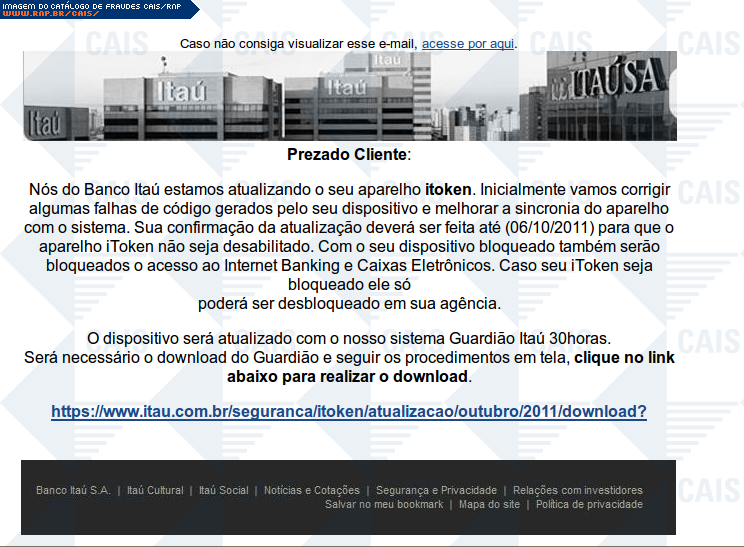 | assunto | Prezado Cliente: Atualização do seu aparelho itoken disponivel! | |