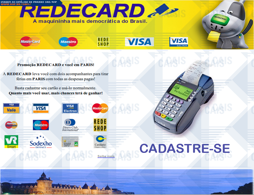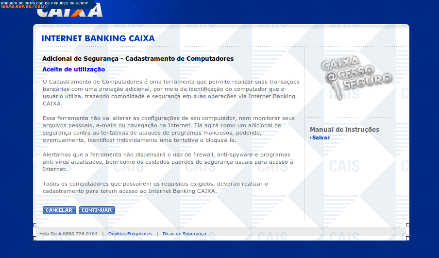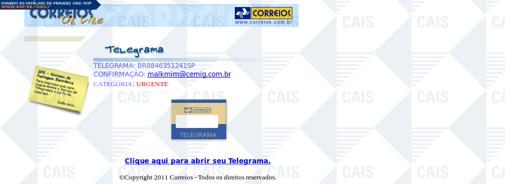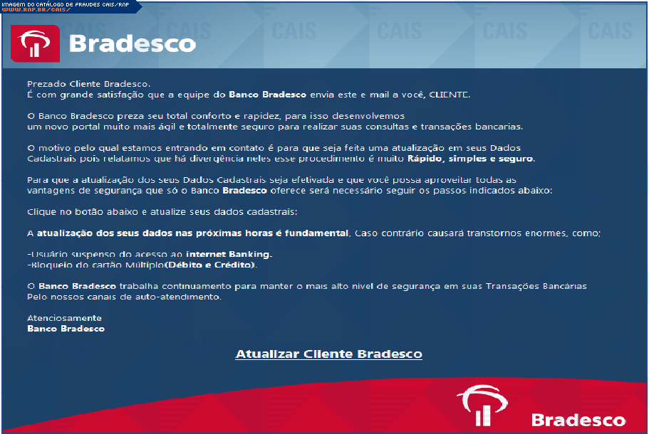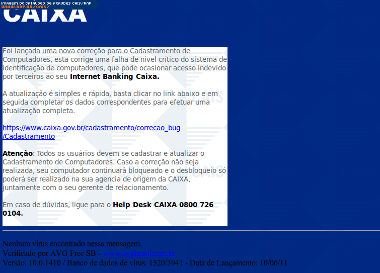 Esta página tem função informativa e educativa. Exibe uma coleção de imagens de phishing scam (fraudes eletrônicas) ou malware (código malicioso) veiculados por meio de spam (e-mail não-solicitado). Trata-se de conteúdo exemplificativo, não exaustivo, uma vez que não é possível contemplar todos os casos de fraudes existentes. Assim, caso você tenha conhecimento de um exemplar que não esteja aqui presente, isto não significa que não seja válido ou real. Inclusive incentivamos que você o envie para análise do CAIS para que, se for o caso, passe a integrar o nosso acervo.