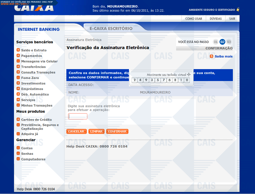 | comentário | A fraude informa à vítima que ela deve realizar uma atualização no seu cadastro no banco, e contém um link que redireciona para a página onde essa atualização deve ser feita. A página é uma tentativa de phishing muito bem desenvolvida, pois contém, por exemplo,... (leia mais) | |