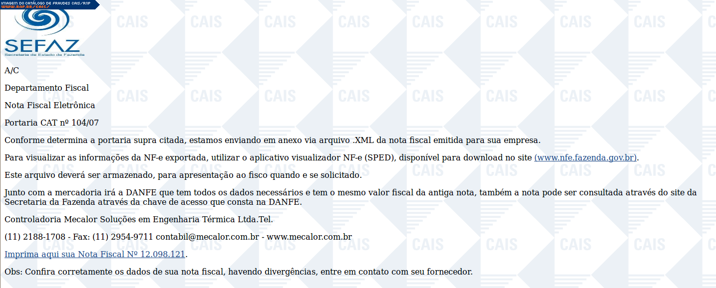 | comentário | A fraude diz à vítima que ela possui uma nota fiscal em seu nome e contém um link para o download da suposta nota fiscal. Provavelmente tratava-se de um malware. Contudo, tal arquivo não estava disponível no momento da análise. | |