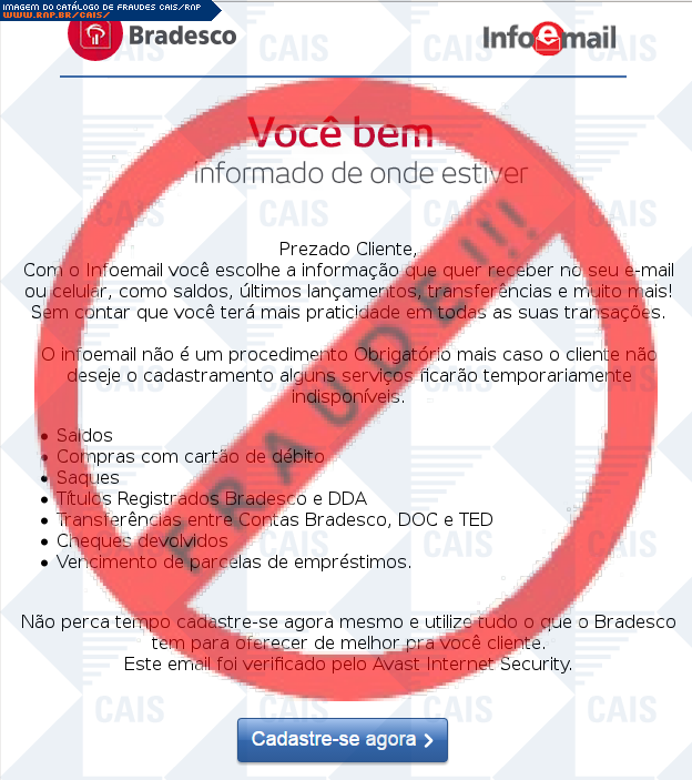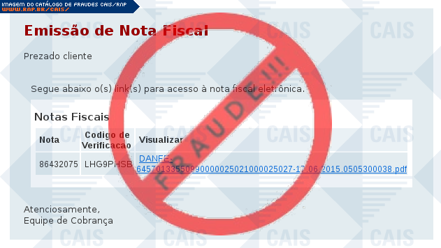 Esta página tem função informativa e educativa. Exibe uma coleção de imagens de phishing scam (fraudes eletrônicas) ou malware (código malicioso) veiculados por meio de spam (e-mail não-solicitado). Trata-se de conteúdo exemplificativo, não exaustivo, uma vez que não é possível contemplar todos os casos de fraudes existentes. Assim, caso você tenha conhecimento de um exemplar que não esteja aqui presente, isto não significa que não seja válido ou real. Inclusive incentivamos que você o envie para análise do CAIS para que, se for o caso, passe a integrar o nosso acervo.