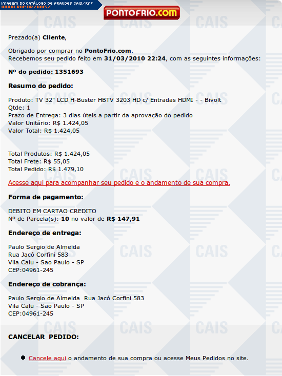 | comentário | Mensagem se passando pelo Ponto Frio confirmando o recebimento de suposto pedido da vítima no valor de R$ 1.479,10 a serem pagos no cartão de crédito. Os links na fraude que permitiriam cancelar o pedido e ver outras informações do pedido levam a um malware... (leia mais) | |