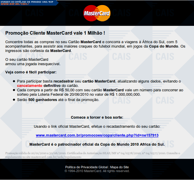 | comentário | Mensagem se passando pela Mastercard comunicando promoção na qual os clientes concorrem a ingressos para a Copa do Mundo e a R$ 1 milhão. Para participar, o cliente deveria recadastrar seu cartão através de um link indicado na fraude. Tal link, indisponível... (leia mais) | |
