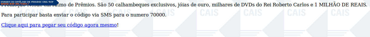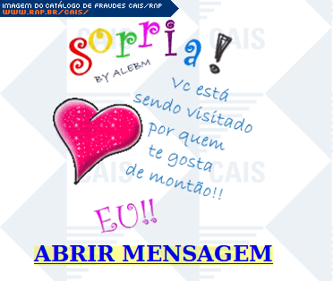 Esta página tem função informativa e educativa. Exibe uma coleção de imagens de phishing scam (fraudes eletrônicas) ou malware (código malicioso) veiculados por meio de spam (e-mail não-solicitado). Trata-se de conteúdo exemplificativo, não exaustivo, uma vez que não é possível contemplar todos os casos de fraudes existentes. Assim, caso você tenha conhecimento de um exemplar que não esteja aqui presente, isto não significa que não seja válido ou real. Inclusive incentivamos que você o envie para análise do CAIS para que, se for o caso, passe a integrar o nosso acervo.