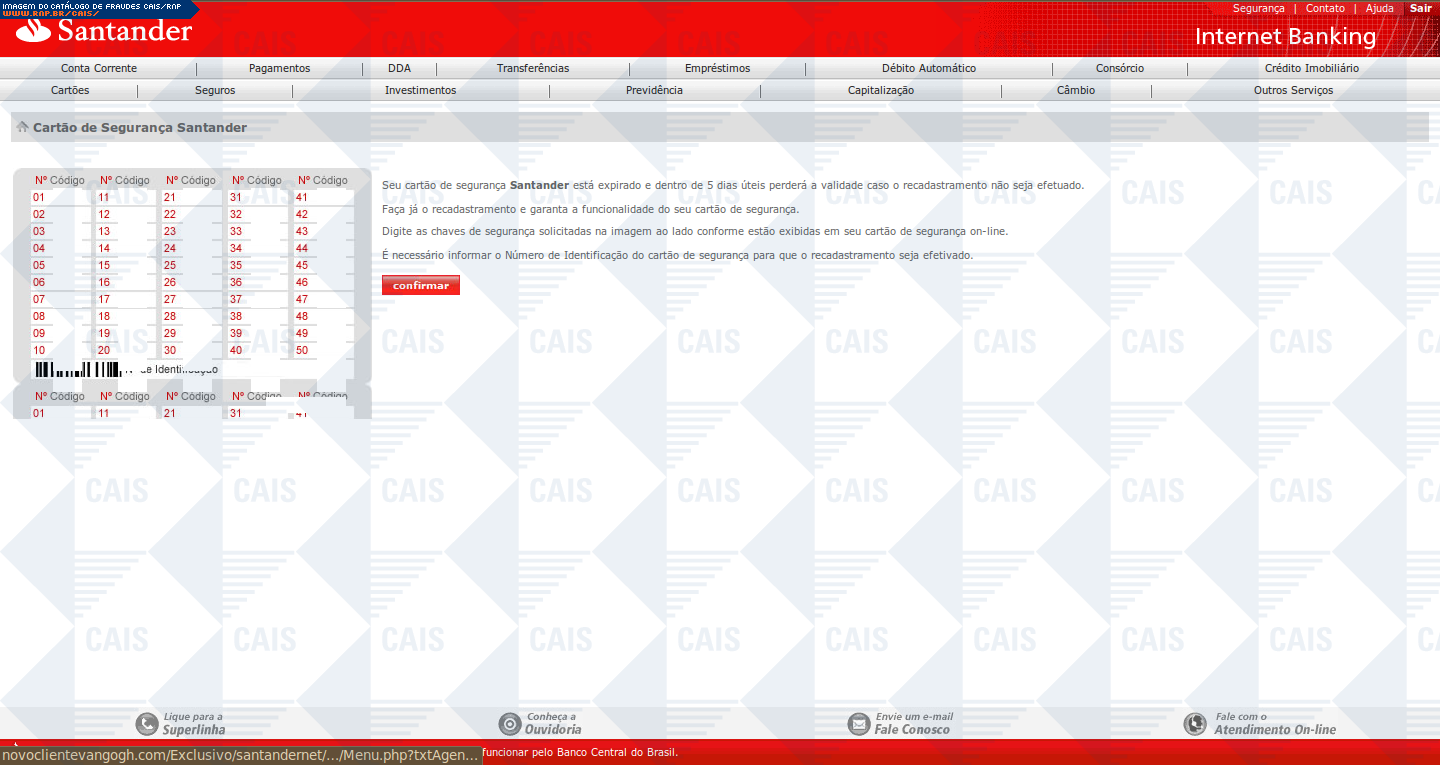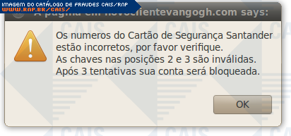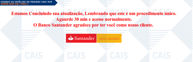 | comentário | Mensagem falsa do banco Santander convidando clientes Van Gogh a fazer o cadastro no Santander Internet Banking. O link para o suposto cadastro leva a uma página falsa, destinada a coletar dados da conta bancária da vítima. | |
