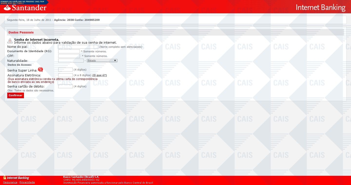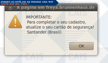 Esta página tem função informativa e educativa. Exibe uma coleção de imagens de phishing scam (fraudes eletrônicas) ou malware (código malicioso) veiculados por meio de spam (e-mail não-solicitado). Trata-se de conteúdo exemplificativo, não exaustivo, uma vez que não é possível contemplar todos os casos de fraudes existentes. Assim, caso você tenha conhecimento de um exemplar que não esteja aqui presente, isto não significa que não seja válido ou real. Inclusive incentivamos que você o envie para análise do CAIS para que, se for o caso, passe a integrar o nosso acervo.