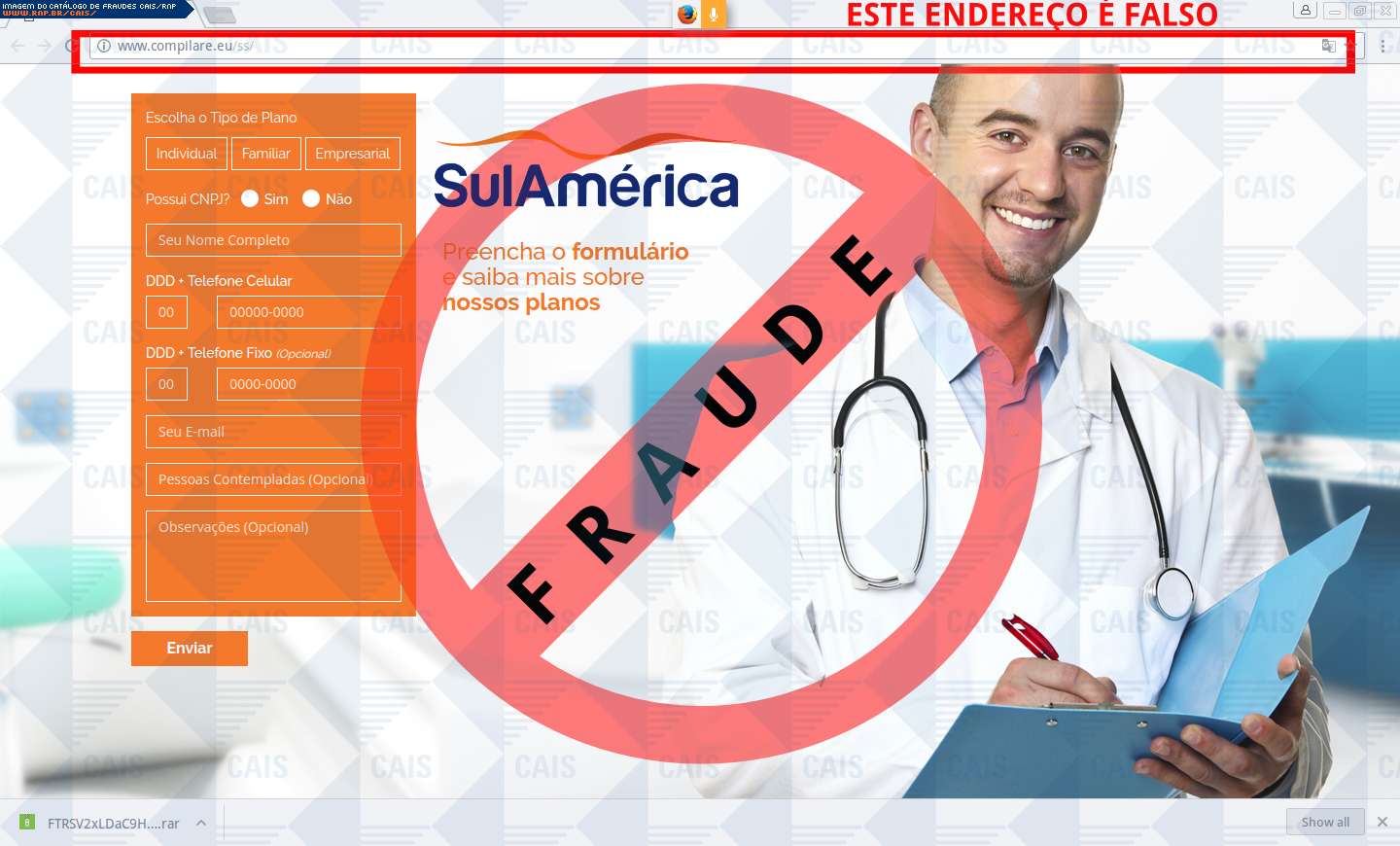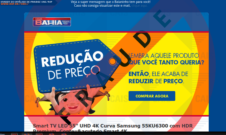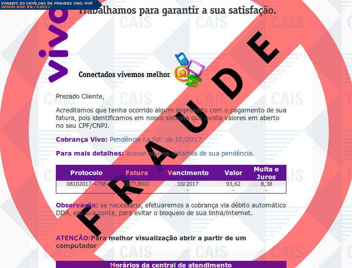 Esta página tem função informativa e educativa. Exibe uma coleção de imagens de phishing scam (fraudes eletrônicas) ou malware (código malicioso) veiculados por meio de spam (e-mail não-solicitado). Trata-se de conteúdo exemplificativo, não exaustivo, uma vez que não é possível contemplar todos os casos de fraudes existentes. Assim, caso você tenha conhecimento de um exemplar que não esteja aqui presente, isto não significa que não seja válido ou real. Inclusive incentivamos que você o envie para análise do CAIS para que, se for o caso, passe a integrar o nosso acervo.