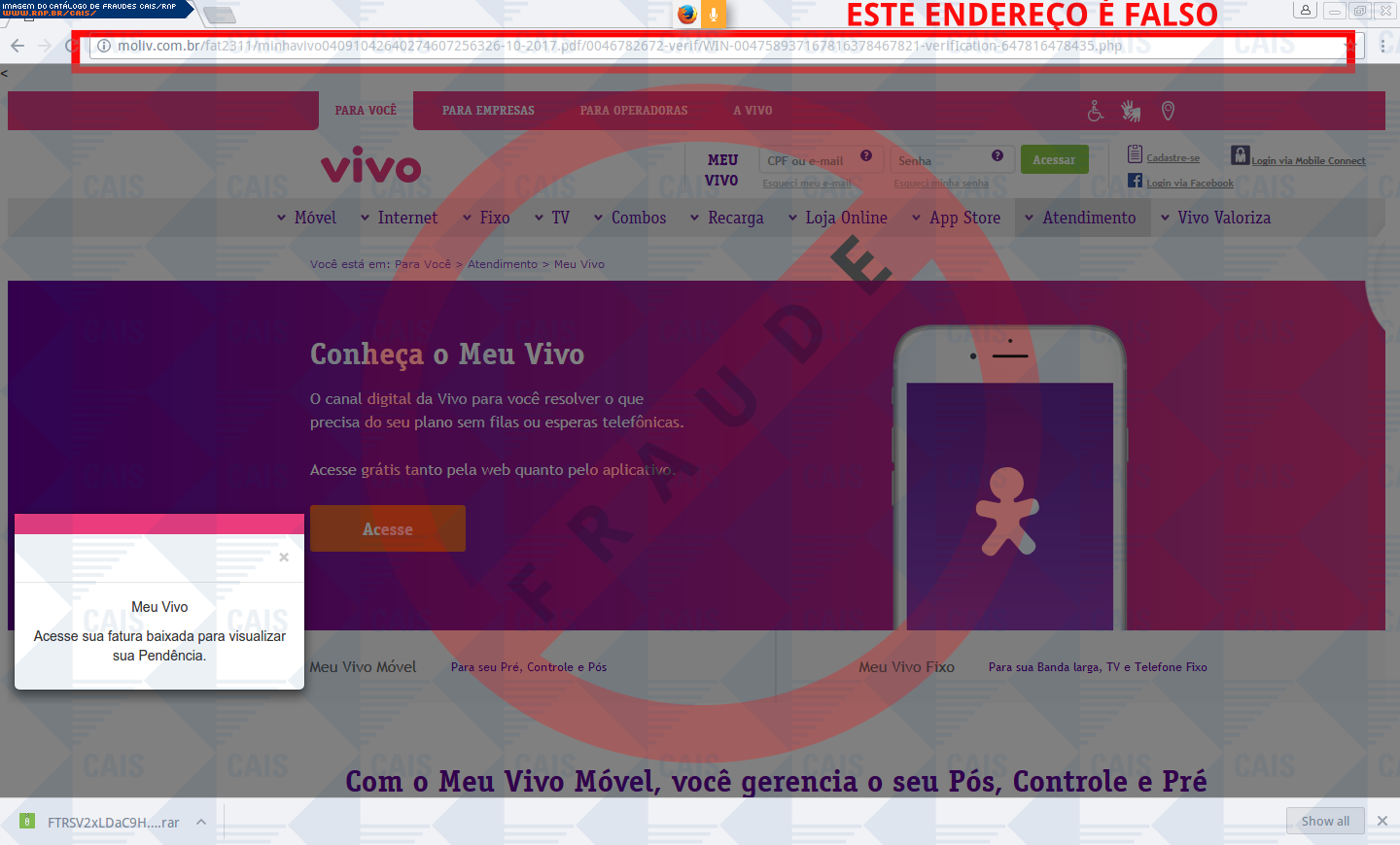 | comentário | O usuário recebe uma mensagem contendo um arquivos disponível para download, no entanto o arquivo originado é malicioso criado para roubar informações da vítima e instalar outros arquivos fraudulentos. | |