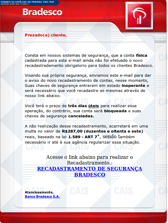 | comentário | Mensagem com alguns erros de português se passando por comunicado do Banco Bradesco sobre recadastramento de clientes. Segundo o texto, a vítima ainda não realizou o cadastro e, caso isto não seja feito em três dias úteis a partir do recebimento da mensagem,... (leia mais) | |