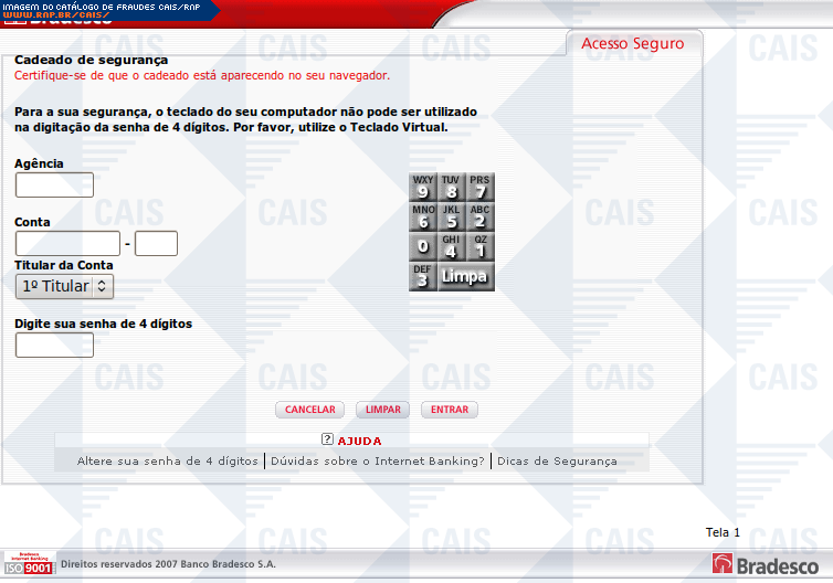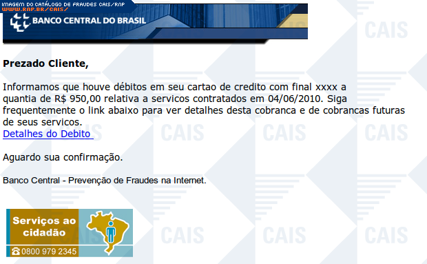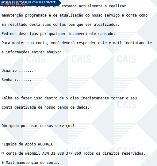 Esta página tem função informativa e educativa. Exibe uma coleção de imagens de phishing scam (fraudes eletrônicas) ou malware (código malicioso) veiculados por meio de spam (e-mail não-solicitado). Trata-se de conteúdo exemplificativo, não exaustivo, uma vez que não é possível contemplar todos os casos de fraudes existentes. Assim, caso você tenha conhecimento de um exemplar que não esteja aqui presente, isto não significa que não seja válido ou real. Inclusive incentivamos que você o envie para análise do CAIS para que, se for o caso, passe a integrar o nosso acervo.