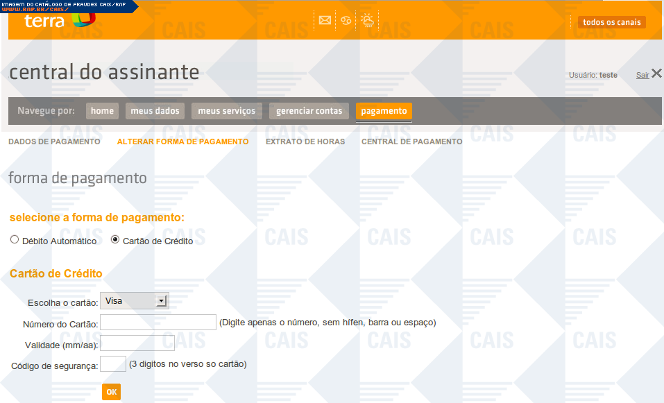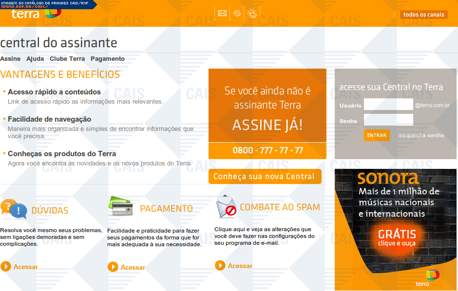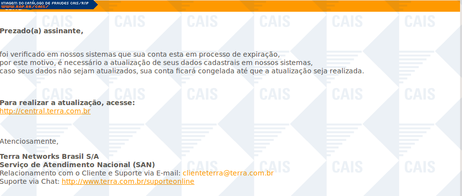| comentário | Mensagem supostamente do portal terra informando que a conta da vítima encontra-se em processo de expiração. Para que a conta não seja encerrada, é pedido que os dados cadastrais sejam atualizados. O link para atualização dos dados leva a uma conta falsa... (leia mais) | |