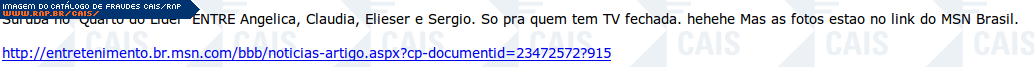 | comentário | Fraude informando suposta orgia entre participantes do Big Brother Brasil 10. As imagens teriam sido liberadas somente para os assinantes do pay-per-view mas as fotos estariam disponíveis na internet. O link disponível na mensagem para acesso às fotos direcionam... (leia mais) | |