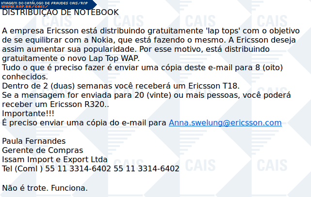 | comentário | Fraude com texto dizendo que a empresa Ericson estaria distribuindo gratuitamente notebooks do tipo Lap Top WAP com o objetivo "de se equilibrar com a Nokia". Para ter acesso ao prêmio, a vítima deveria enviar o email para o maior número possível de pessoas,... (leia mais) | |