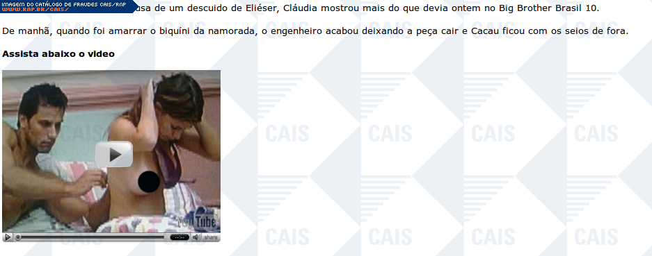 | comentário | Fraude com suposto video embutido do YouTube que conteria imagens de uma participante do Big Brother Brasil 10 com os seios descobertos. A imagem que tenta se passar pelo vídeo do YouTube é na verdade um link para conteúdo malicioso não disponível no momento... (leia mais) | |