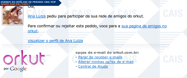 | comentário | Mensagem se passando por notificação do orkut de pedido de amizade feito supostamente por alguém de nome Ana Luiza. A fraude é bastante semelhante à notificação do Orkut. Porém, todos os links da mensagem direcionam a vítima para conteúdo malicioso não disponível... (leia mais) | |
