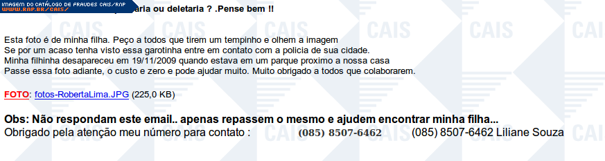 | comentário | Mensagem contendo suposto apelo de mãe em busca de sua filha desaparecida. O texto pede que a vítima abra o link fornecido para olhar a foto da criança. O link direciona a vítima para um malware identificado como TrojanDownloader:Win32/Bancos.BV (Microsoft). obs.:... (leia mais) | |