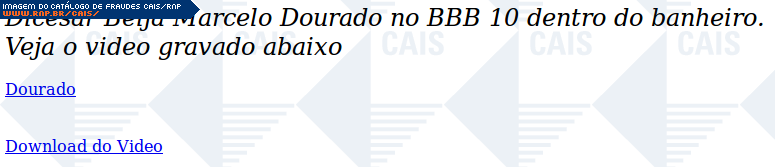 | comentário | Mensagem anunciando suposto vídeo dos participantes Dicesar e Marcelo do Big Brother Brasil 10 fazendo sexo. Os links da fraude que levariam ao vídeo direcionam a vítima para um malware identificado como BehavesLike:Trojan.Downloader (F-Secure). | |