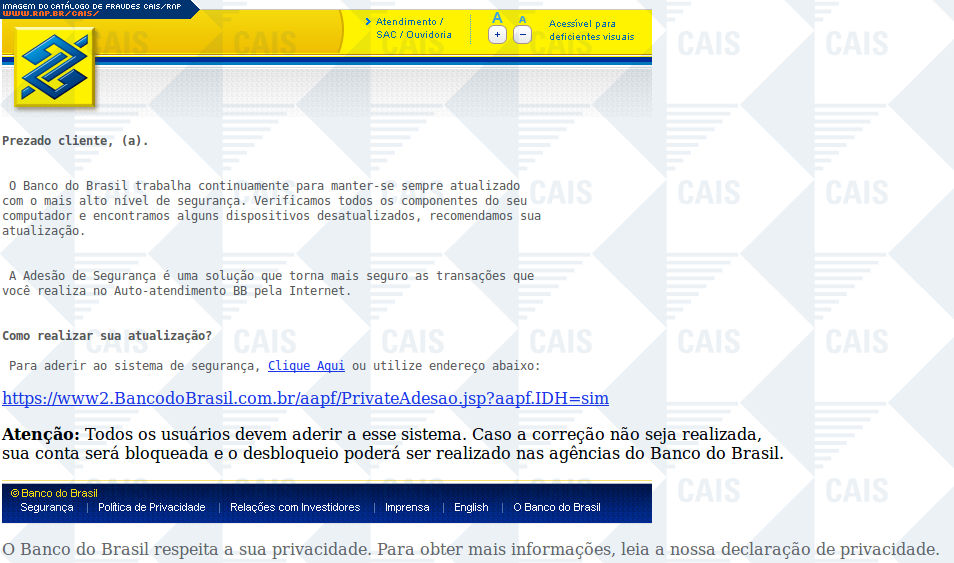 Esta página tem função informativa e educativa. Exibe uma coleção de imagens de phishing scam (fraudes eletrônicas) ou malware (código malicioso) veiculados por meio de spam (e-mail não-solicitado). Trata-se de conteúdo exemplificativo, não exaustivo, uma vez que não é possível contemplar todos os casos de fraudes existentes. Assim, caso você tenha conhecimento de um exemplar que não esteja aqui presente, isto não significa que não seja válido ou real. Inclusive incentivamos que você o envie para análise do CAIS para que, se for o caso, passe a integrar o nosso acervo.