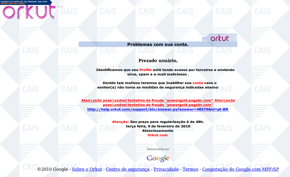 | comentário | Mensagem se passando por notificação do Orkut sobre problemas na conta da vítima. O texto diz que a conta está sendo usada para envio de conteúdo malicioso e o problema pode ser resolvido com a adoção de medidas indicadas em uma página acessível por link... (leia mais) | |