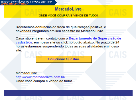 | comentário | Mensagem supostamente enviada pelo Mercado Livre dizendo que a conta da vítima foi denunciada por troca de qualificações positivas e vendas irregulares. Segundo o texto, a conta será suspensa caso a vítima não entre em contato com o Departamento de Supervisão... (leia mais) | |