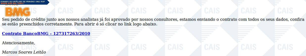 | comentário | Mensagem se passando pelo Banco BMG notificando aprovação de crédito para a vítima e pedindo para que os dados sejam conferidos. O link para o contrato leva a conteúdo malicioso não disponível no momento da análise. | |