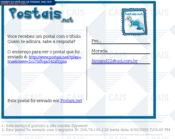 | comentário | Mensagem dizendo que a vítima recebeu um cartão virtual do site postais.net. Para ver o postal a vítima deveria entrar em uma página, cujo link é fornecido no texto da fraude. Na página indicada pelo link aparece uma mensagem dizendo que a versão do flash... (leia mais) | |