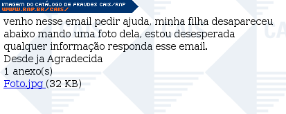 | comentário | Fraude com pedido de ajuda "desesperado" de mãe que cuja filha está desaparecida. A mensagem fornece um link que possibilitaria ver a foto da menina. O link leva a um software malicioso identificado como PSW.Banker5.OVX (AVG). | |