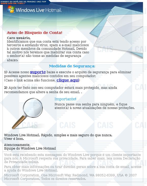 | comentário | Comunicado se passando pela Microsoft reportando à vitima que seu MSN será bloqueado por motivos de segurança, devido a "acessos de terceiros" à conta. Para a correção do problema o texto fornece um link para baixar e intalar um "arquivo de segurança" que... (leia mais) | |