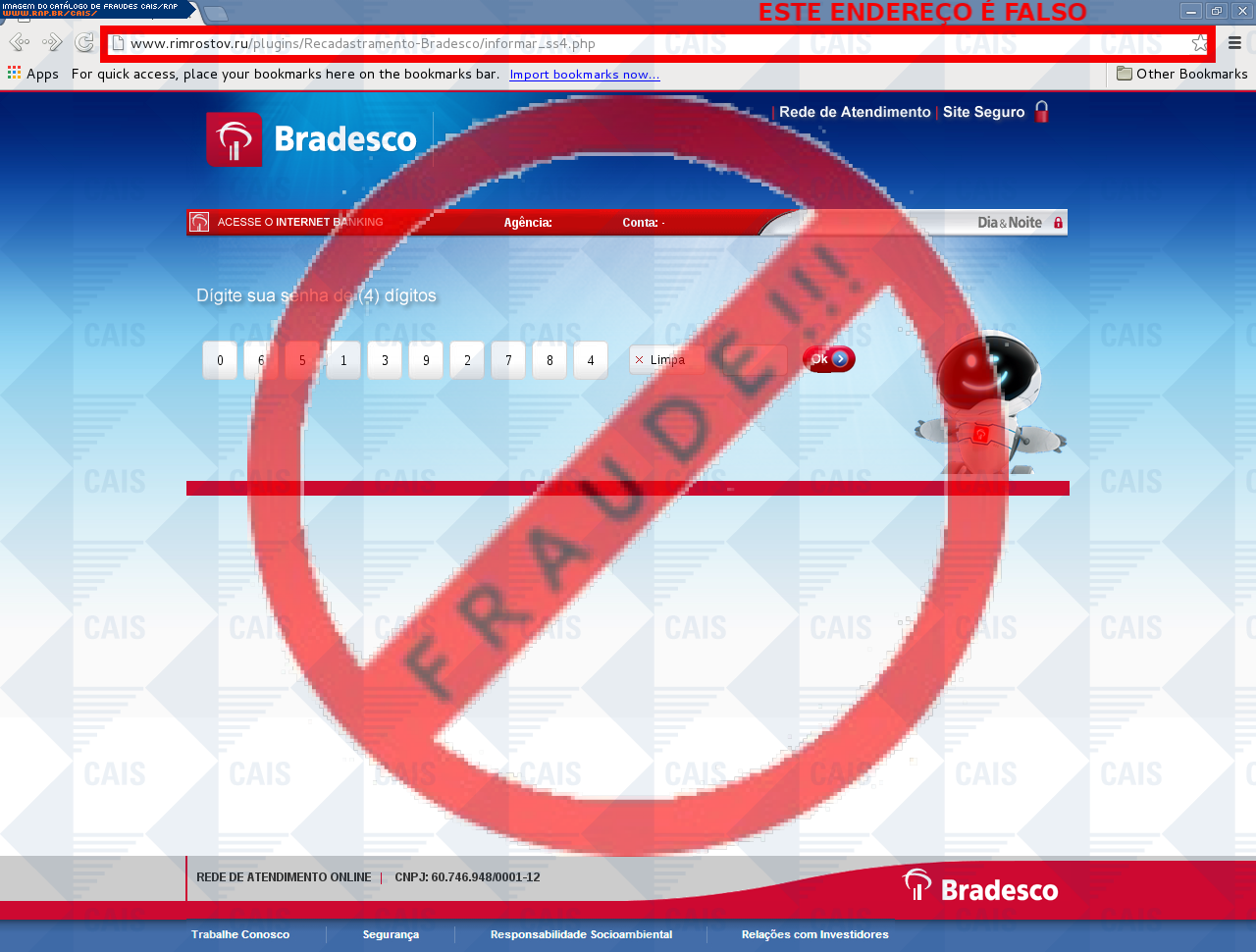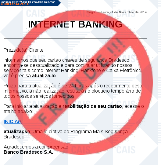 | comentário | O usuário recebe um e-mail informando que seu cartão chave de segurança da conta do banco Bradesco encontra-se desatualizado sendo necessário realizar a atualização no link disponibilizado, entretanto a página fornecida é falsa criada para roubar os dados... (leia mais) | |