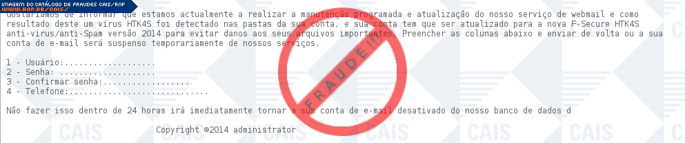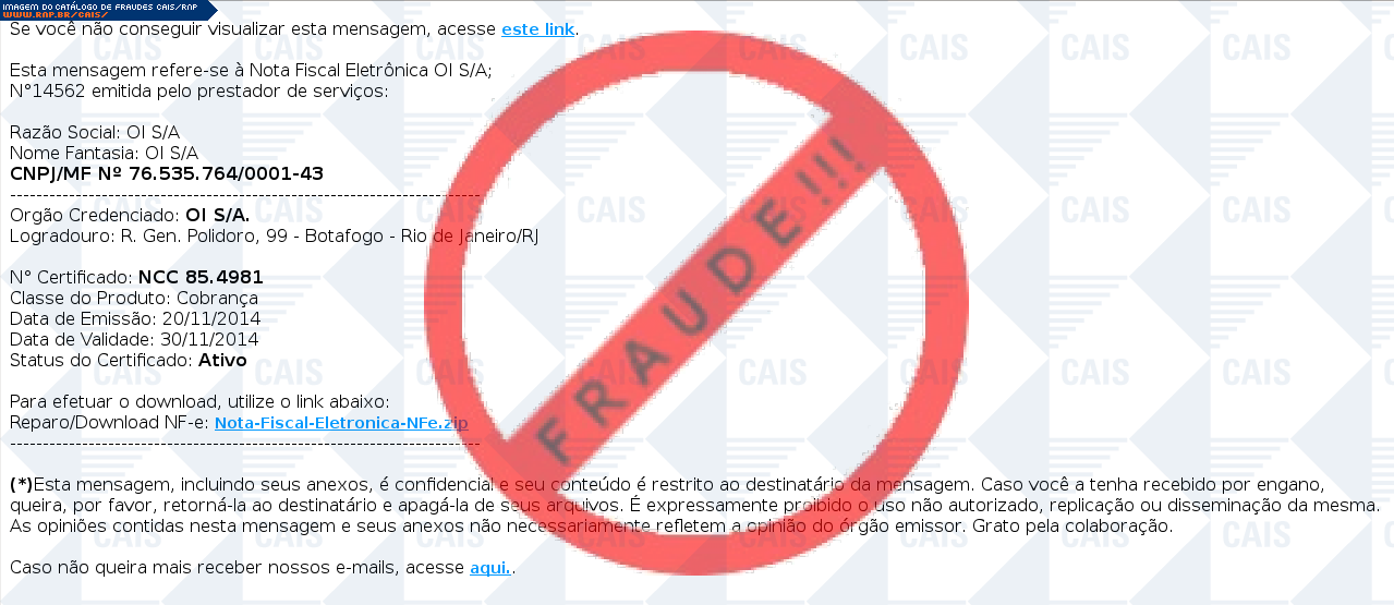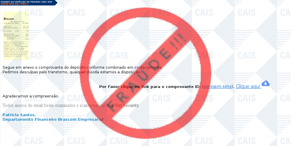 Esta página tem função informativa e educativa. Exibe uma coleção de imagens de phishing scam (fraudes eletrônicas) ou malware (código malicioso) veiculados por meio de spam (e-mail não-solicitado). Trata-se de conteúdo exemplificativo, não exaustivo, uma vez que não é possível contemplar todos os casos de fraudes existentes. Assim, caso você tenha conhecimento de um exemplar que não esteja aqui presente, isto não significa que não seja válido ou real. Inclusive incentivamos que você o envie para análise do CAIS para que, se for o caso, passe a integrar o nosso acervo.