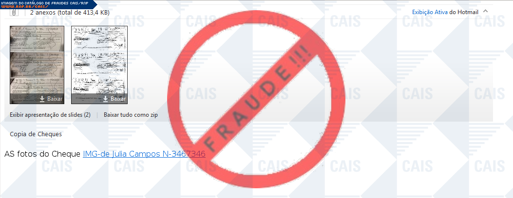| comentário | O usuário recebe uma mensagem contendo imagens de um cheque disponível para download, no entanto o arquivo originado é malicioso criado para roubar informações da vítima e instalar outros arquivos fraudulentos com o nome de Trojan.GenericKD.1991875. | |