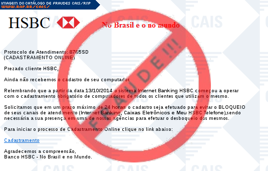 | comentário | A vítima recebe uma mensagem informando que sua conta no banco HSBC necessita de um recadastramento para utilizar alguns serviços sendo necessário realiza-lo no link disponibilizado, no entanto a página é falsa destinada a roubar as informações bancárias... (leia mais) | |