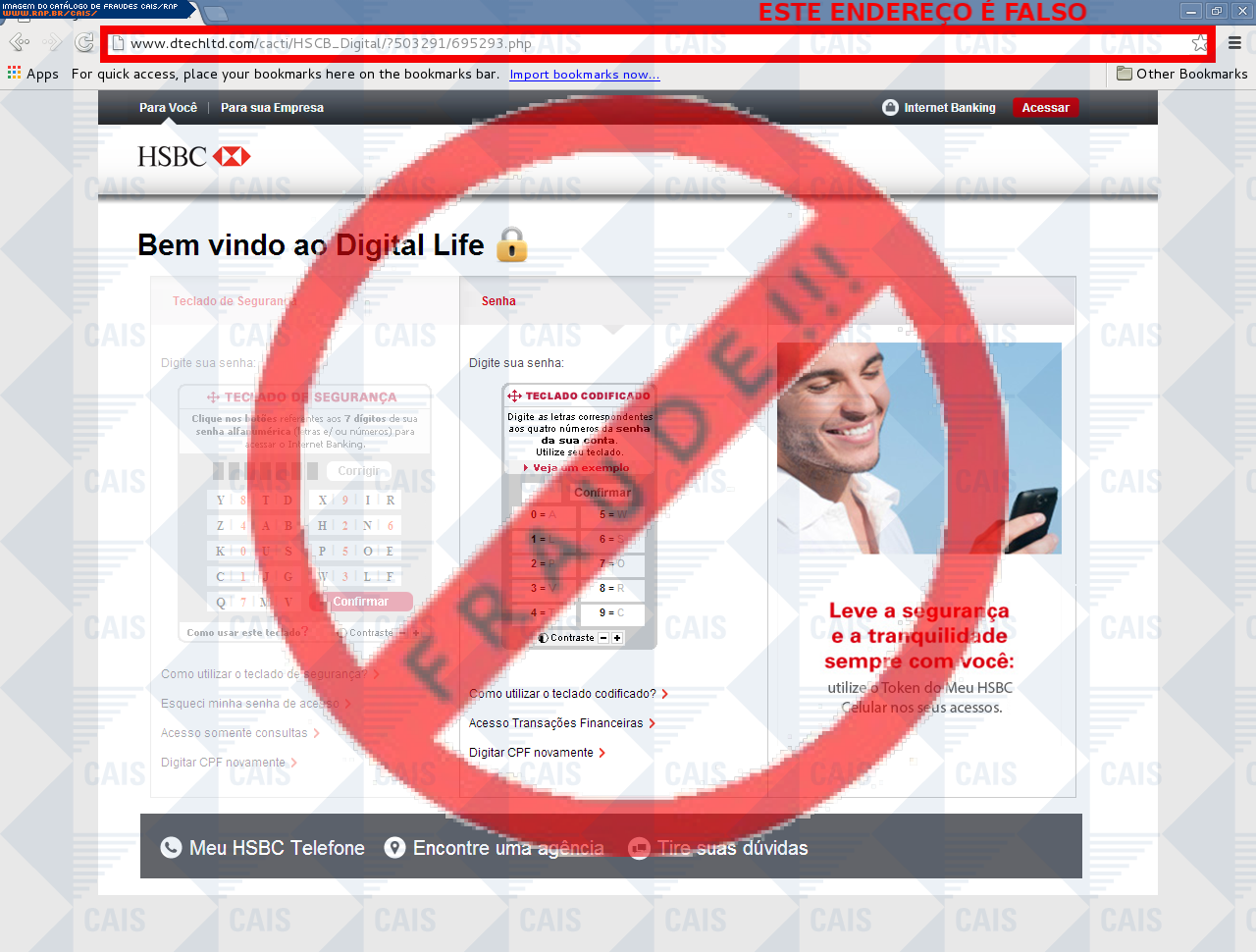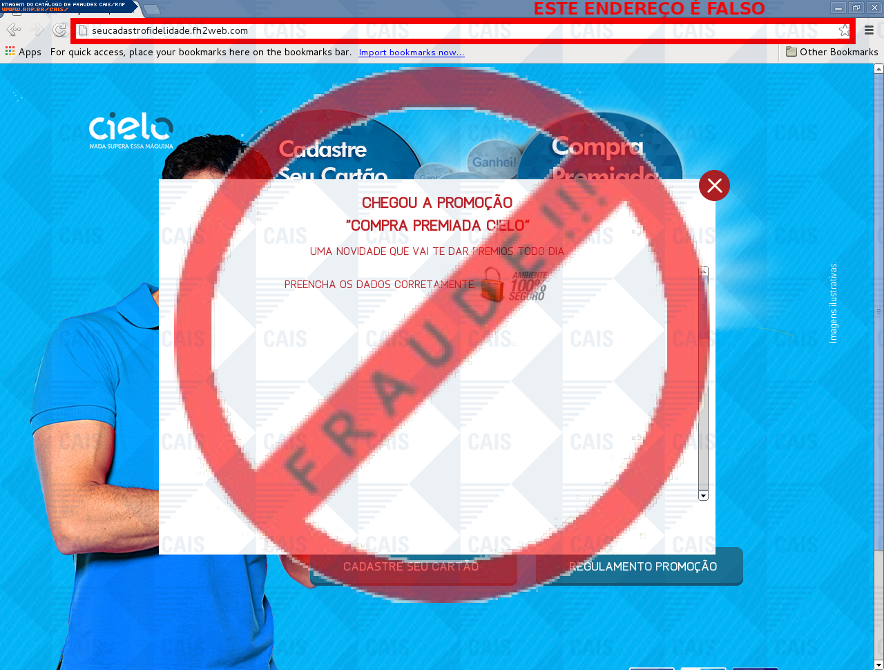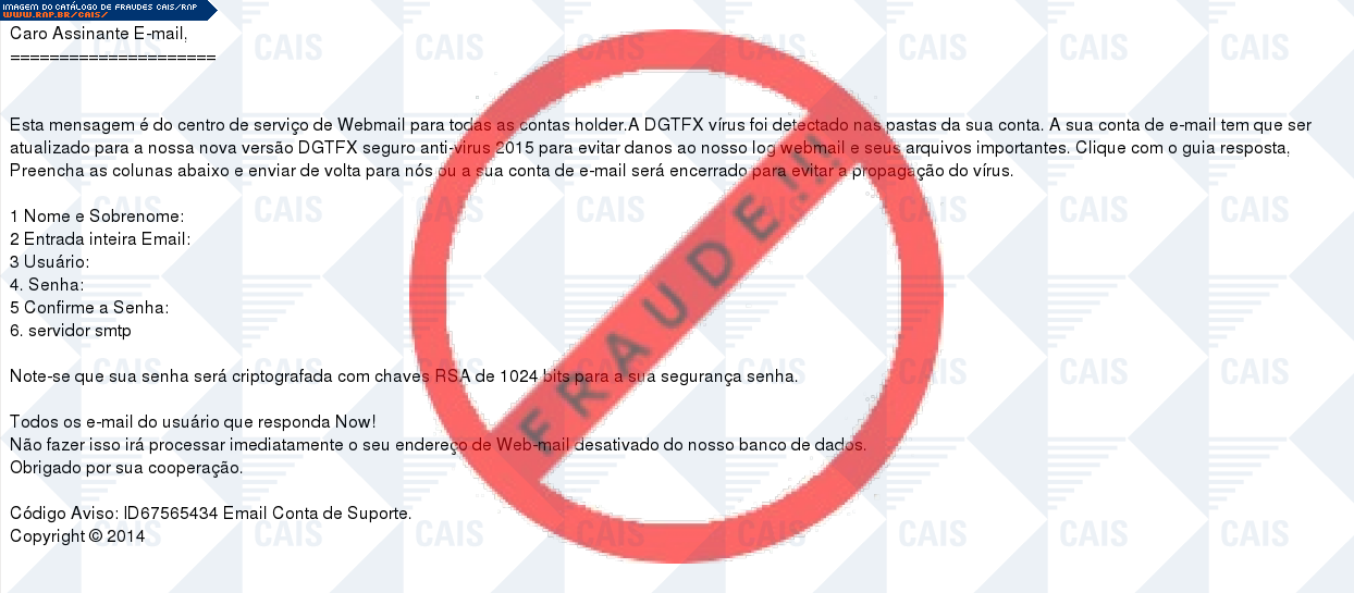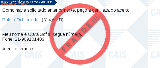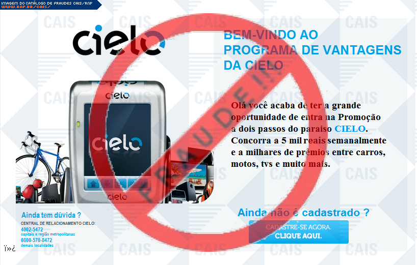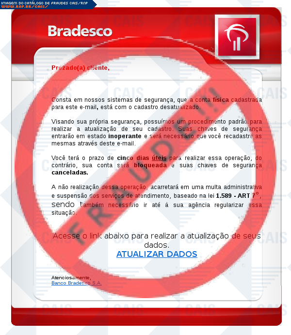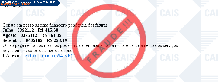 Esta página tem função informativa e educativa. Exibe uma coleção de imagens de phishing scam (fraudes eletrônicas) ou malware (código malicioso) veiculados por meio de spam (e-mail não-solicitado). Trata-se de conteúdo exemplificativo, não exaustivo, uma vez que não é possível contemplar todos os casos de fraudes existentes. Assim, caso você tenha conhecimento de um exemplar que não esteja aqui presente, isto não significa que não seja válido ou real. Inclusive incentivamos que você o envie para análise do CAIS para que, se for o caso, passe a integrar o nosso acervo.