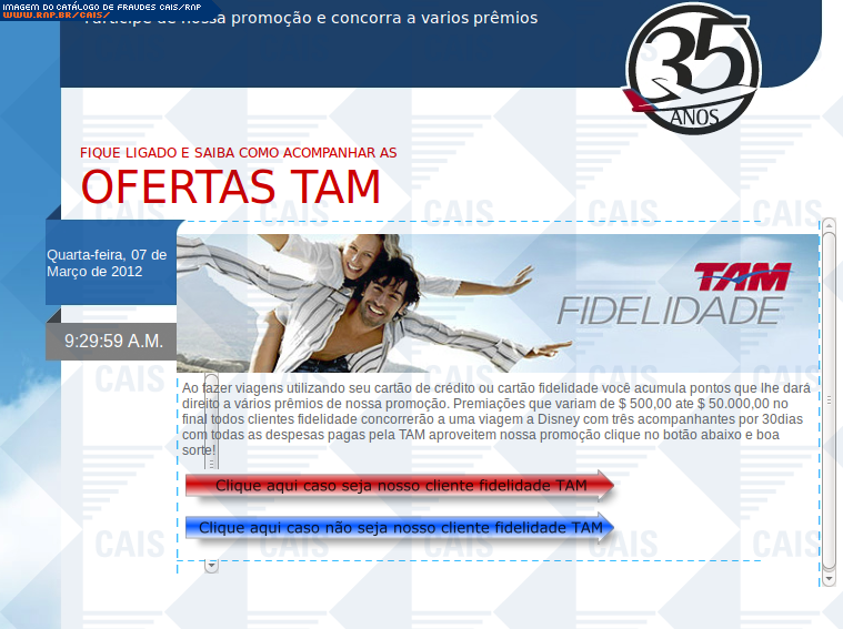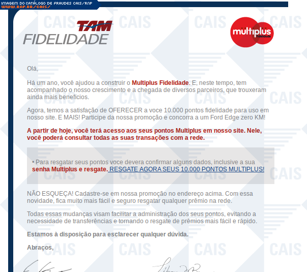 | comentário | Falsa mensagem oferece cadastro em promoção da Tam que promete milhas e outros prêmios, além de um resgate imediato de 50.000 pontos multiplus. Havia um link para cadastro ou recadastro, contudo esta leva à uma falsa página da Taml na qual dados confidenciais... (leia mais) | |