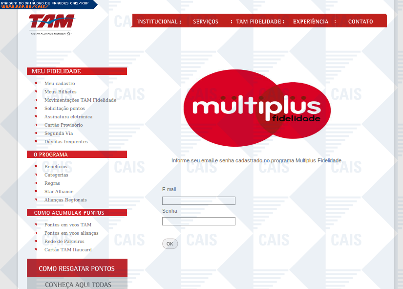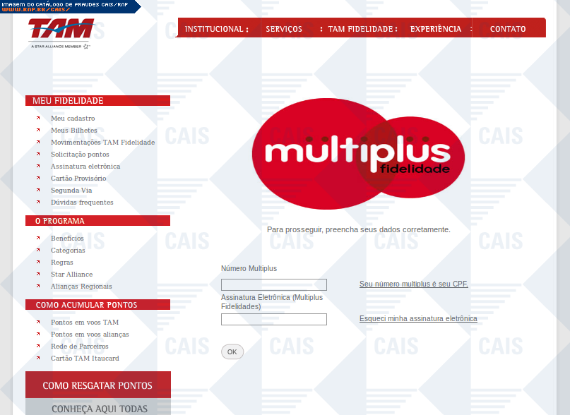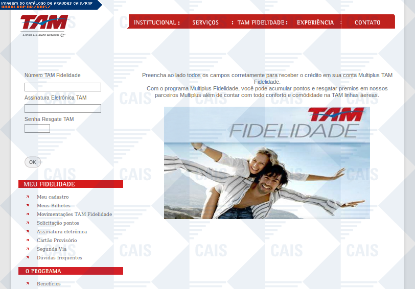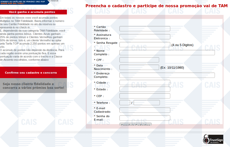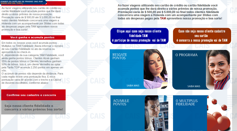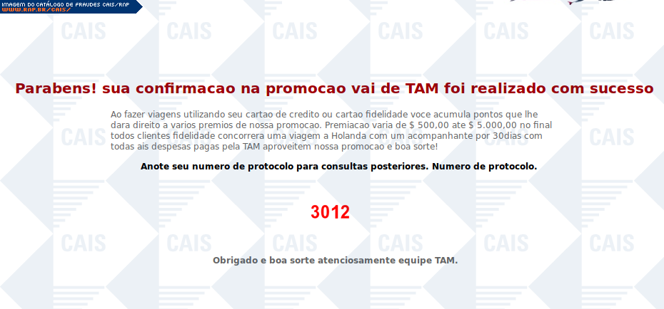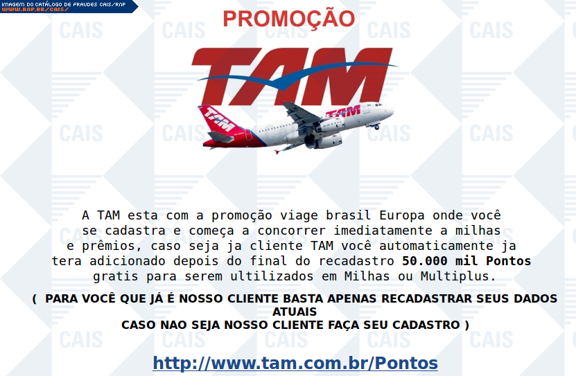 | comentário | Falsa promoção em nome da Tam oferece participação em promoção e resgate imediato de 10.000 póntos. Contudo, o link para cadastro e resgate de tais pontos, na verdade, leva à uma falsa página da Tam, na qual dados confidenciais são solicitados. | |