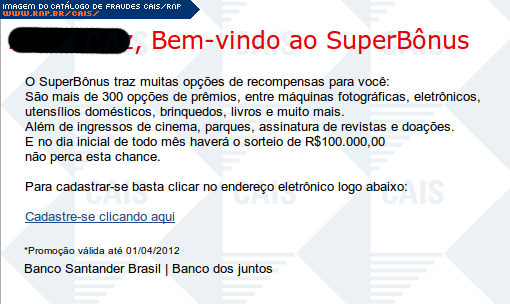 | comentário | A fraude contém um link para o cadastro em uma promoção do banco Santander. O conteúdo malicioso não estava disponível no momento da análise. | |