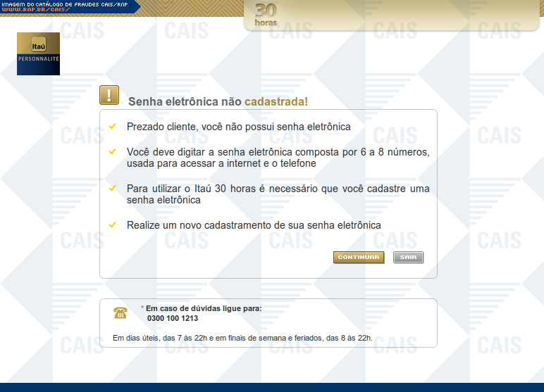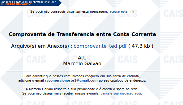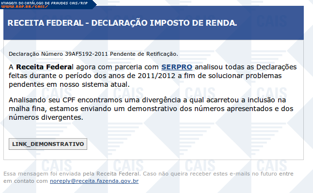Esta página tem função informativa e educativa. Exibe uma coleção de imagens de phishing scam (fraudes eletrônicas) ou malware (código malicioso) veiculados por meio de spam (e-mail não-solicitado). Trata-se de conteúdo exemplificativo, não exaustivo, uma vez que não é possível contemplar todos os casos de fraudes existentes. Assim, caso você tenha conhecimento de um exemplar que não esteja aqui presente, isto não significa que não seja válido ou real. Inclusive incentivamos que você o envie para análise do CAIS para que, se for o caso, passe a integrar o nosso acervo.