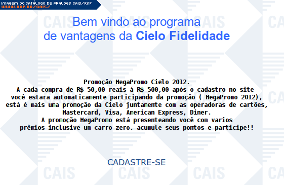 | comentário | Comunicado falso, em nome da Cielo, com um link para o cadastro no Programa de Vantagens Cielo Fidelidade. O conteúdo malicioso não estava mais disponível no momento da análise. | |