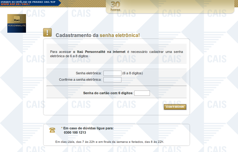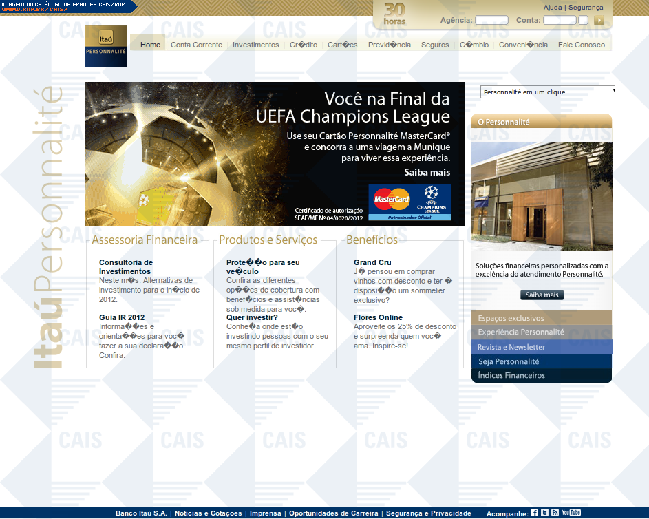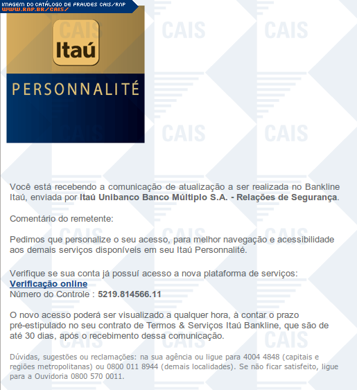 | comentário | Mensagem falsa do banco Itaú informando sobre uma suposta atualização para clientes Personalité. A fraude contém um link que leva a uma página falsa que tenta aliciar a vítima a fornecer seus dados pessoais. | |