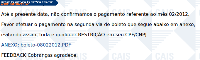 | comentário | Aviso em nome de FEEDBACK Cobrancas à respeito de um suposto boleto em atraso. Há um link para download de tal boleto, porém este leva ao download de um malware identificado como: Win32:Delf-RNB [Trj] (Avast). | |