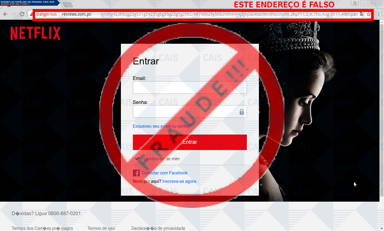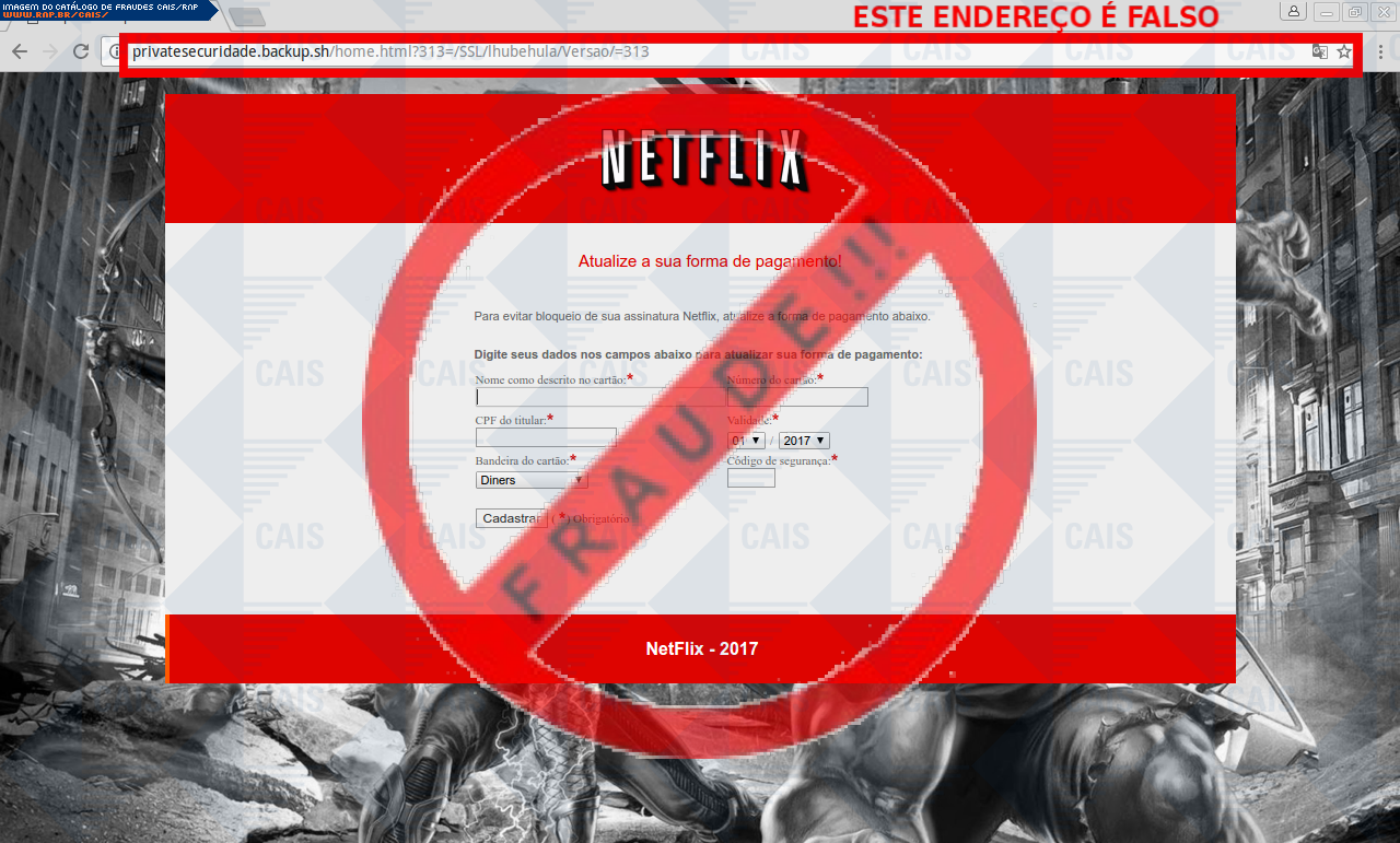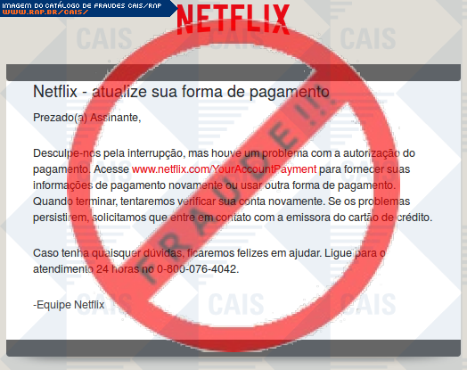 | comentário | O usuário recebe uma mensagem informando que para continuar utilizando os serviços Netflix será necessário atualizar algumas informações disponível no link, entretanto a página é falsa criada para roubar os dados do e-mail da vítima. | |