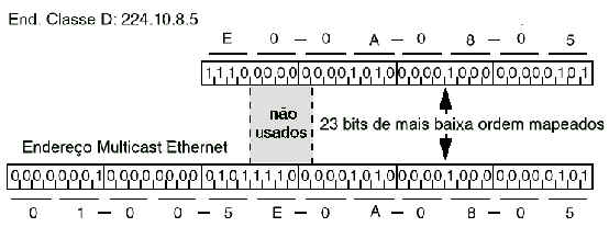 Um endereço de grupo IP é mapeado em um endereço Ethernet, inserindo-se os 28 bits de mais baixa ordem do mesmo nos 23 bits de mais baixa ordem ordem do bloco de endereços reservado à IANA. A Figura 1 mostra como o endereço de grupo multicast IP 224.10.8.5 (E0-0A-08-05) seria mapeado em um endereço multicast Ethernet (IEEE 802).